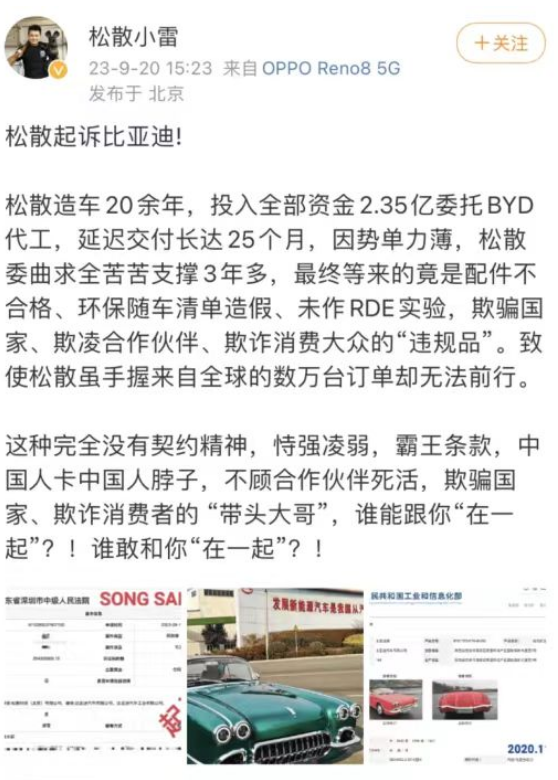 翻旧账了哈,找回2023年底松散掌柜诉讼BYD的微博吐槽,这里说自己有“全球数万台订单”,“花光2.35亿委托BYD代工”……